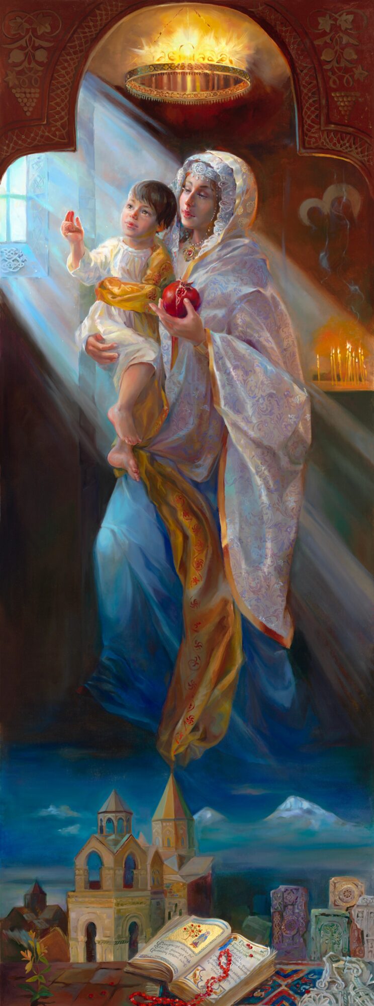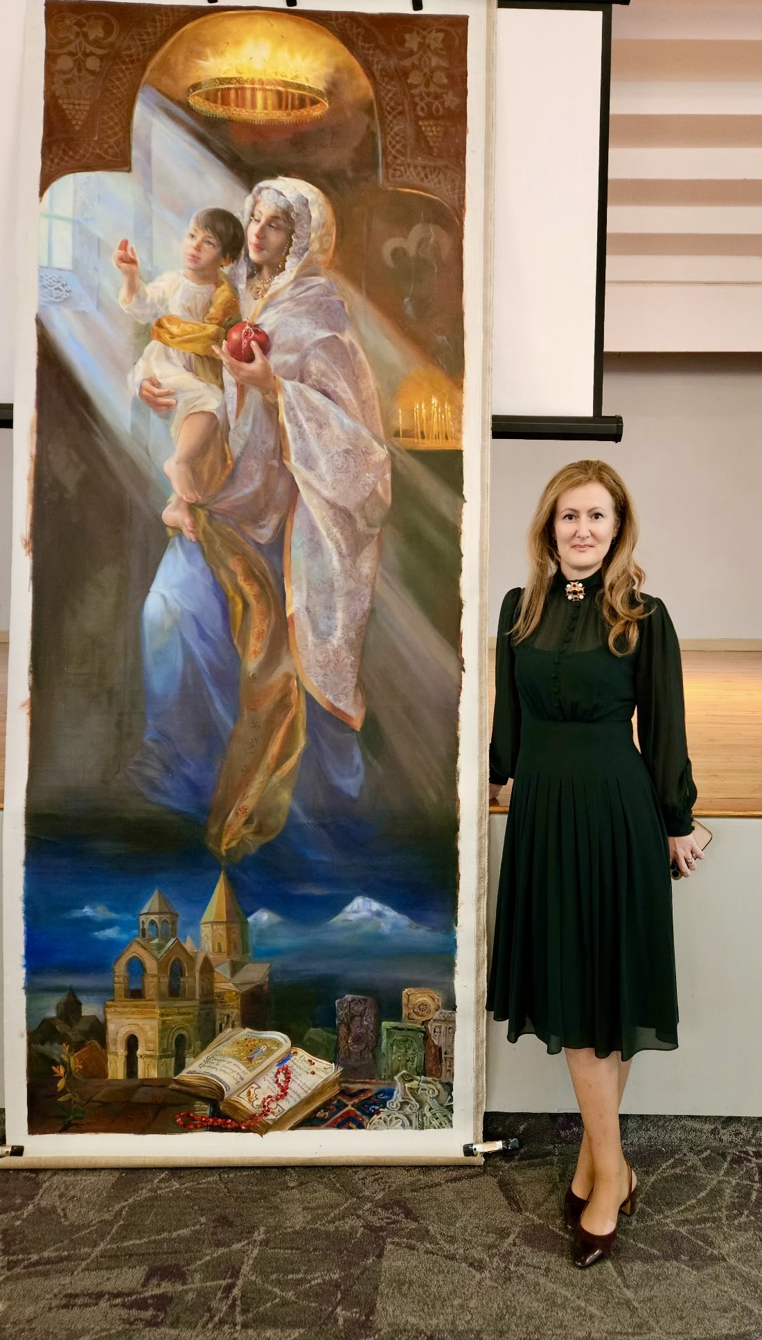 Madonna del Armenia is my response to that inheritance. It is not simply a reinterpretation, but a continuation and a dialogue across time. The work brings together traditional iconography, personal history, and contemporary experience. It reflects the idea that culture is not static or confined to geography; it is something we carry, reshape, and pass forward. Presenting the work within Armenian cultural and spiritual spaces, including St. Vartan Cathedral, has been one of the most meaningful experiences of my career because it closes a generational loop while opening a new one. This 10 foot painting will eventually travel to its permanent home in Etchmiadzin Cathedral, the spiritual center of Armenia.